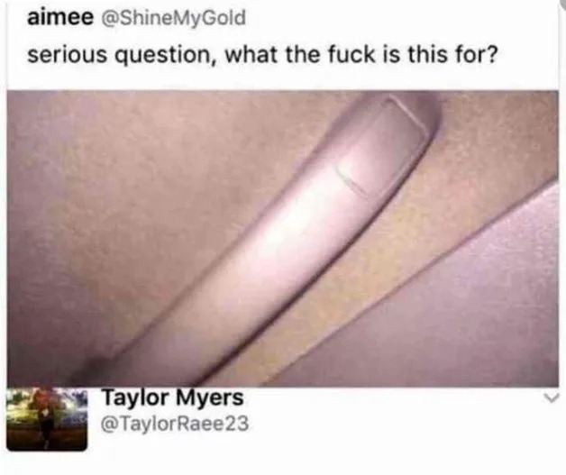 Hilarious Twitter theories aside, according to Technology.org there is a legitimate purpose. The handles, also known as ‘grab handles’ are for people to use to help get into and out of a vehicle. It’s as simple as this. Personally, I like the ‘oh sh*t’ handle theory myself. Oh well.
